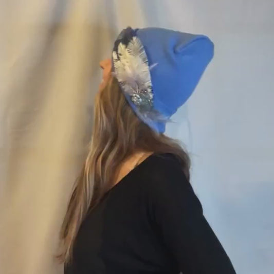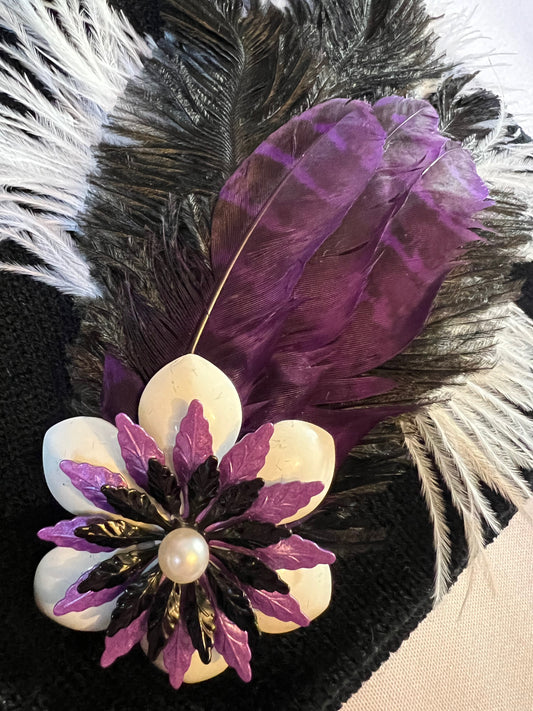 Each piece is handmade. Every feather hand trimmed. Then adornment with vintage jewels. These hats are designed with a symmetry effect. Meaning wears it as you feel fit, side to side rotation, half rolled up cuff, etc.